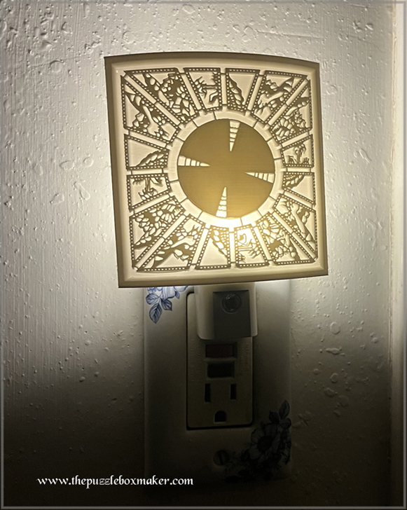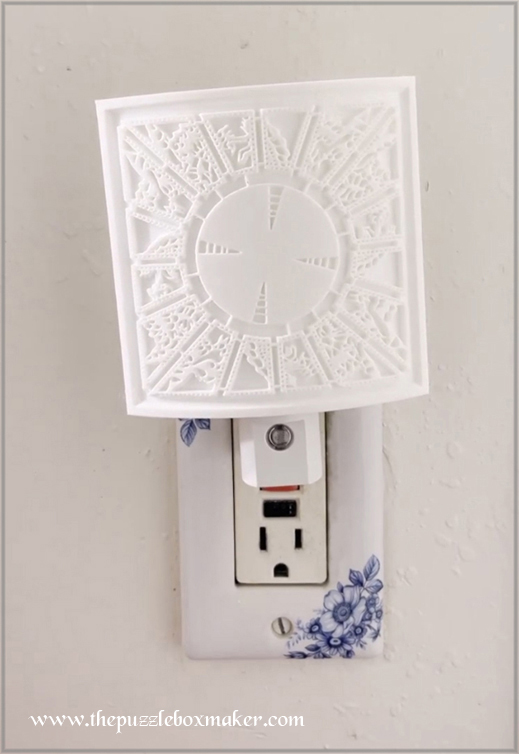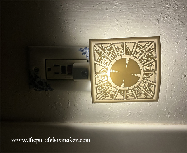 Hellraiser Puzzle Box Night Light – LED Dusk-Till-Dawn Night Light – Pinhead The Hellraiser Puzzle Box prop replica that we make, we’ve now turned into a Night Light. The schematic are derived from the Original Hellraiser Puzzle Boxes designed by Simon Sayce for Hellraiser 1 and Hellraiser 2. We used our template artwork we use for our Brass and foil boxes to create this beautiful 3D printed Hellraiser Puzzle Box Night Light! So the artwork you see on our Hellraiser Puzzle Boxes you can now see in the dark on your way to Leviathan! The artwork is the top panel of the puzzle box, the one EVERYONE tries to rotate and open the gates of Hell! Our Night Light Plate is 4″ square, and is made with a Warm Colored LED Night Light. These Night Lights are made to last. The Night Light turns on when it starts to get dark and increases in light the darker it gets up to 8 Lumens and turns off when a light is turned on or day breaks. Included is 1 Night Light Wall Socket that the plate fits on perfectly. A must have for any Hellraiser Fan! We typically use only one face, the main face we see in the movie that people run their finger around in a circle to open the box, BUT if you want a differernt plate used in Your night light, we can customize it.
